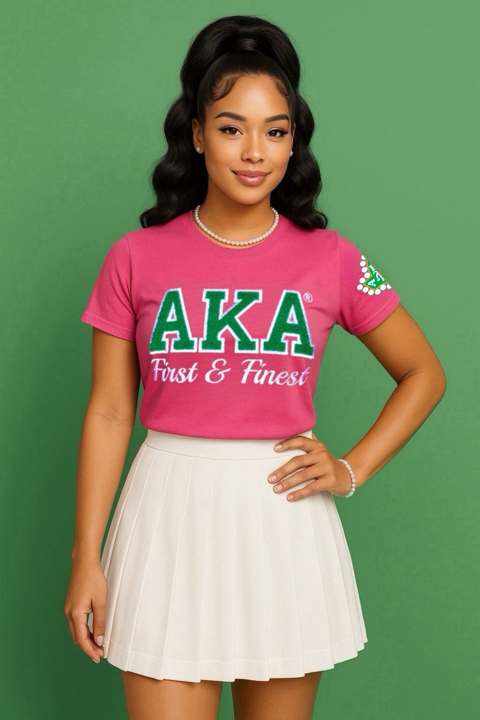 This tee is made from a soft, breathable cotton-polyester blend that offers both comfort and durability. It features the letters AKA in chenille with direct embroidery, and the official Alpha Kappa Alpha® Ivy beautifully embroidered on the left sleeve.