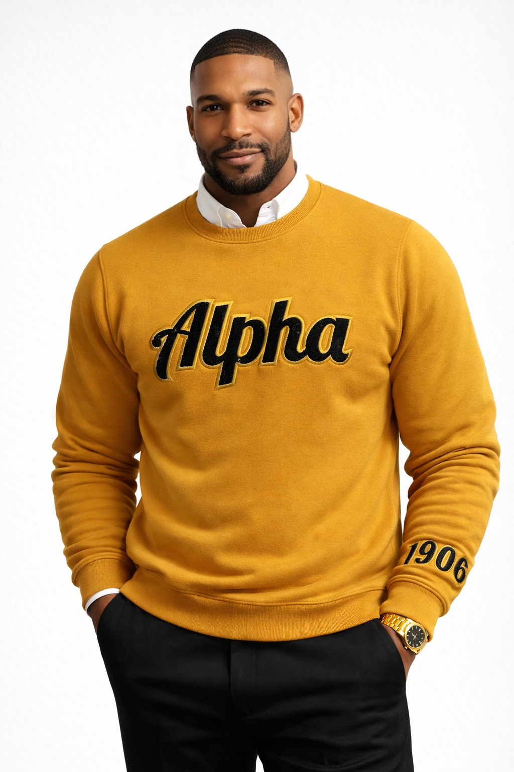 Show your Alpha Phi Alpha pride with this premium gold chenille-lettered sweatshirt. Featuring bold “Alpha” across the chest and “1906” down the sleeve, this sweatshirt blends comfort with timeless fraternity style. Perfect for chapter events, casual wear, or repping the brotherhood with distinction.